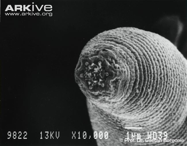 Devil’s worm: Halicephalobus mephisto (see below). This creature is tiny, about 0.5 mm (0.02 inches) in length and they live at the deepest depth ever discovered, 1.3 km (8/10 of a mile) down in the earth’s crust. They were found in a South African gold mine. These worms not only survive the immense pressure at that depth, but high temperatures, too (37 degrees C, or 98.6 F).