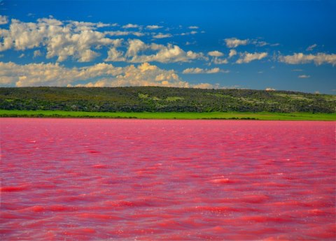 LakeHiller01One of these lakes in particular caught my eye because it’s very unique indeed! The color of the water is bubblegum pink – and it’s a natural formation. The name is Lake Hiller and it’s located on an island in the Middle Recherche Archipelago which is just off the coast of Western Australia.  This archipelago is comprised of 100 islands all near a place called Cape Arid. Lake Hiller is about 600 meters across and is said to be mostly shallow.