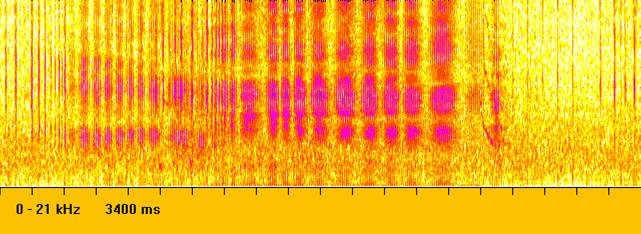 The second echolocation signature is from a Risso’s dolphin, from the Southern Thyrrenian Sea, from the University of Pavia Italy’s Interdisciplinary Center for Bioacoustics and Environmental Research at 0-21 kHz, 3400 msI can see some similarities, but they’re clearly not the same.