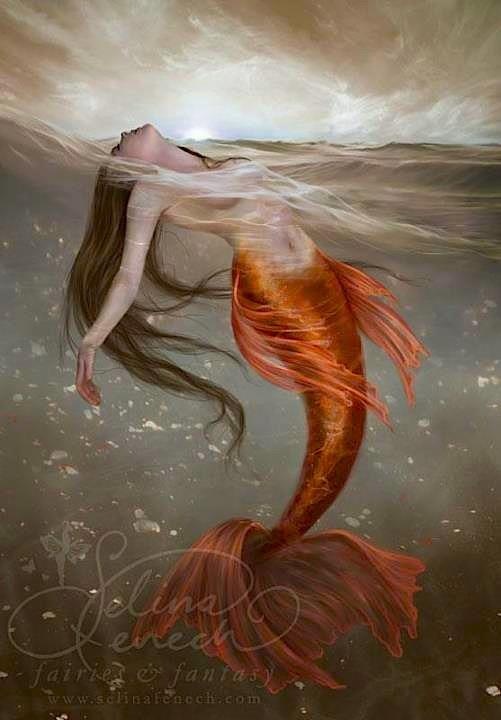 RustRedTailOuter Hebrides Tragedy: Sometime in 1830, a woman was down at the seashore harvesting seaweed when she spied a mermaid frolicking just offshore. The story continues saying two days later, the body of the mermaid was found washed ashore, dead. It’s said the description was recorded somewhere like this, “The upper part of the creature was about the size of a well-fed child of three or four years of age, with an abnormally developed breast. The hair was long, dark, and glossy while the skin was white, soft, and tender. The lower part of the body was like a salmon, but without scales.” (Artwork above right by Selina Fenech.)