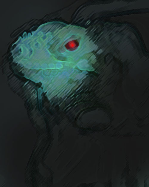 Eva Gauvin Champ sighting drawingThe creature, a pea-green color, sat under the bright light staring out at the Lake for several minutes, apparently unperturbed by the dogs. Christine looked out from her window about thirty feet away, entranced. It moved its head around, then glided off into the water. Christine had the sense it was headed towards the Winooski River.