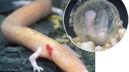 This latest bunch were found in a subterranean cave called Postojna Cave which is located right next to a very popular aquarium. Biologist Saso Weldt reported that on January 30 of this year a female olm laid her eggs on the underside of a big rock. The scientists figure the eggs are due to hatch in April. (Photo right courtesy of ScienceMagazine.org.)